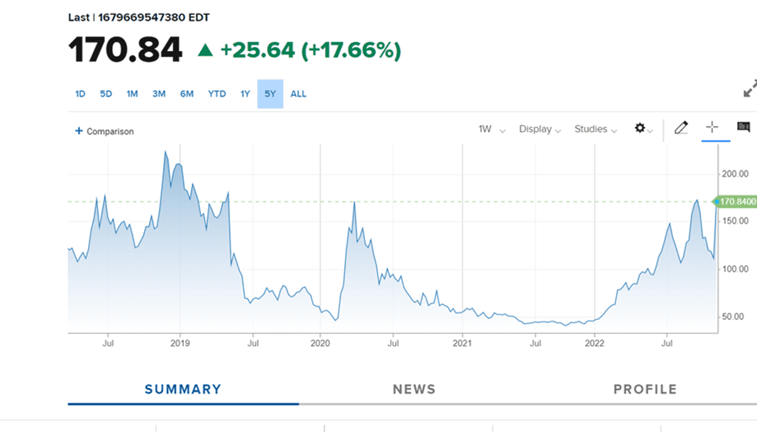 Graf 2: Päťročné CDS – swapy úverového zlyhania Deutsche Bank. Dá sa z nich vyčítať, či rastie alebo klesá pravdepodobnosť bankrotu DB.