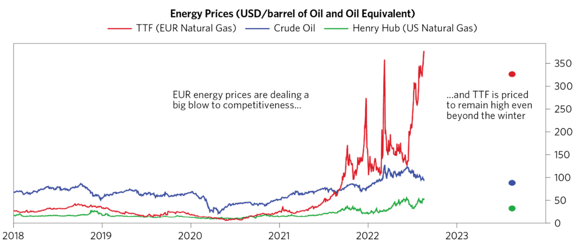 To, čo bolo kedysi nepredstaviteľné, je teraz takmer istotou. Európa bude túto zimu čeliť veľkému poklesu ekonomickej aktivity, pretože nebude mať dostatok energie na chod ekonomiky v takom rozsahu, ako tomu bolo minulé roky. Keďže Európa prerušuje svoje väzby na ruský plyn, súčasný nedostatok energie sa odráža vo vysokých cenách zemného plynu – ceny sú ekvivalentné úrovni 350 USD za barel ropy. Jednoročné ceny elektriny v Nemecku a vo Francúzsku sú približne desaťkrát vyššie než normálne, a to aj pri vážnych opatreniach na obmedzenie dopytu.