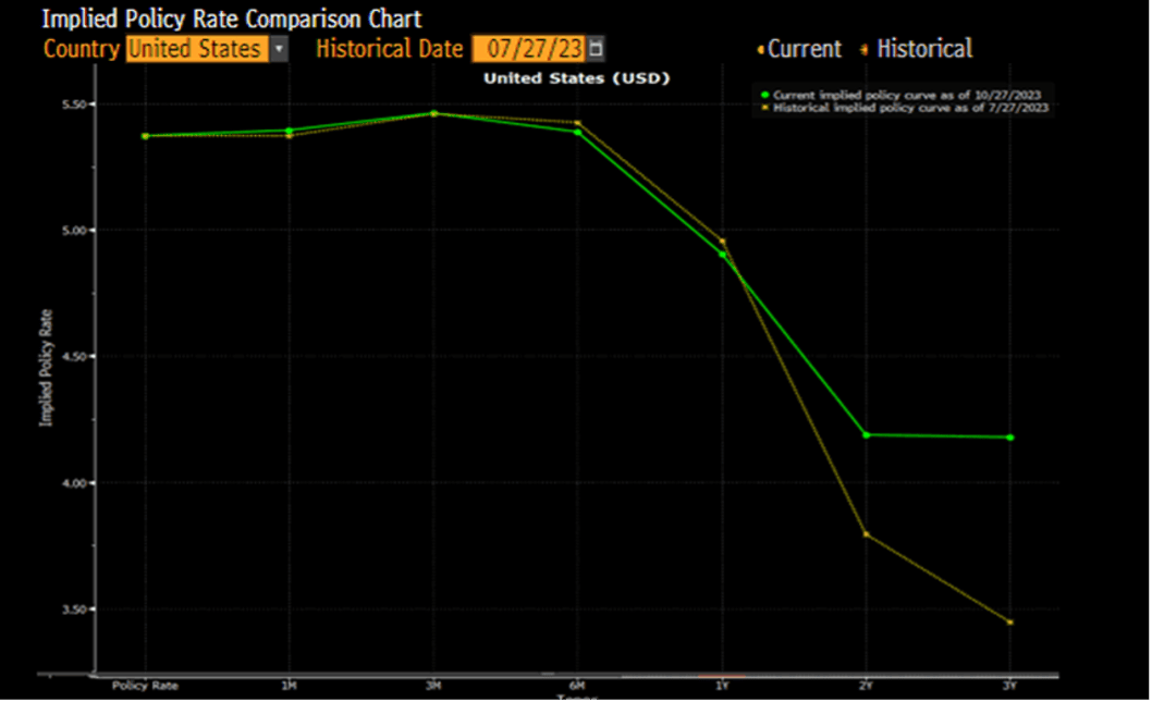 Dobré ekonomické dáta znamenajú silnejšiu infláciu v budúcnosti a možnosť ďalšieho rastu sadzieb. To sa odráža aj na očakávaniach trhu, ktoré projektujú možnosť rastu sadzieb aj nad aktuálnych 5,5 % v najbližších troch mesiacoch. Naopak na záver rok roka 2024 sa už očakáva pokles sadzieb pod úroveň 5 %.