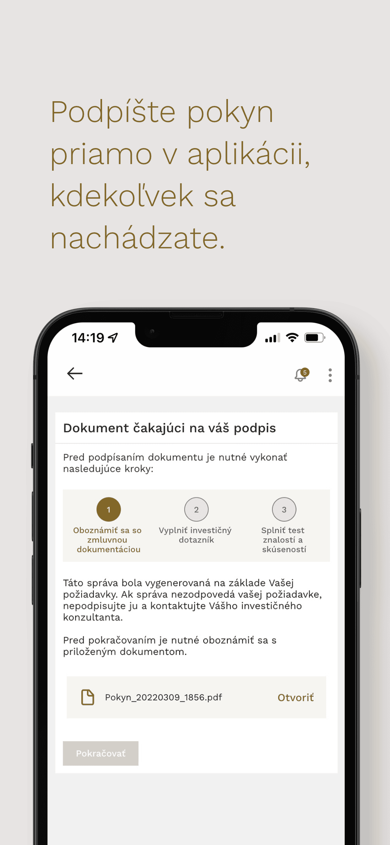 Ak chcete mať dokonalý prehľad o tom, čo sa deje na vašom účte, povoľte aplikácii zasielanie správ (push notifikácie). Pri prvom spustení vás o to aplikácia požiada. Krátkou správou vás budeme informovať vždy, keď prijmeme vašu platbu, keď zašleme peniaze alebo keď vykonáme obchod. Zároveň budete ihneď vedieť o novom dokumente, ktorý v schránke správ čaká na váš podpis. Na pár klikov viete podpísať váš pokyn z ktoréhokoľvek miesta na zemi, stačí internetové pripojenie.