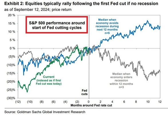 To, či ekonomika skĺzne do recesie alebo nie, sa odráža aj na výkonnosti akciových trhov. Graf ukazuje, že po prvom znížení sadzieb zo strany Fedu, ak do 12 mesiacov nastala recesia, akciový index S&P 500 klesol o 14 %. Naopak, ak do 12 mesiacov od prvého zníženia sadzieb Fedom nenastala recesia, akcie reprezentované indexom S&P 500 boli vyššie o 13 %.